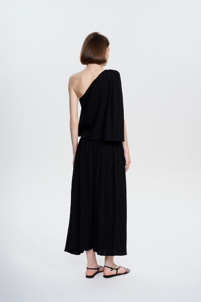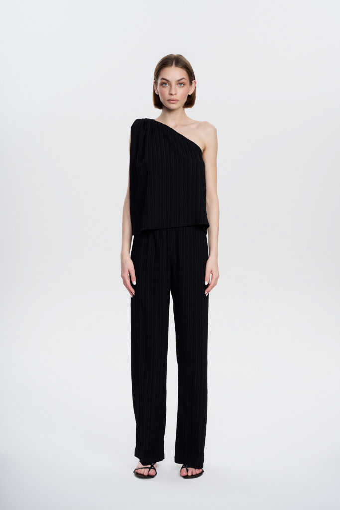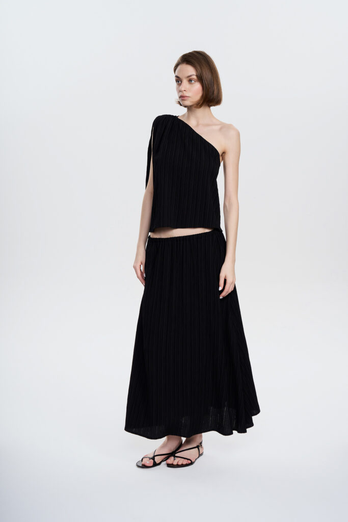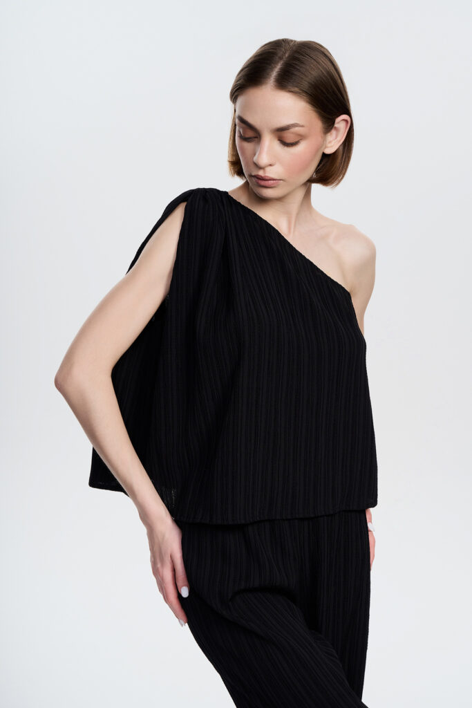 Bluzka na jedno ramię z ozdobnym marszczeniem na ramieniu o luźnym kroju. Połącz ze spodniami Sunset lub spódnicą Christie, aby stworzyć stylowy total look. Wykonana z lekkiej, kreszowanej tkaniny w kolorze czarnym z widoczną strukturą.