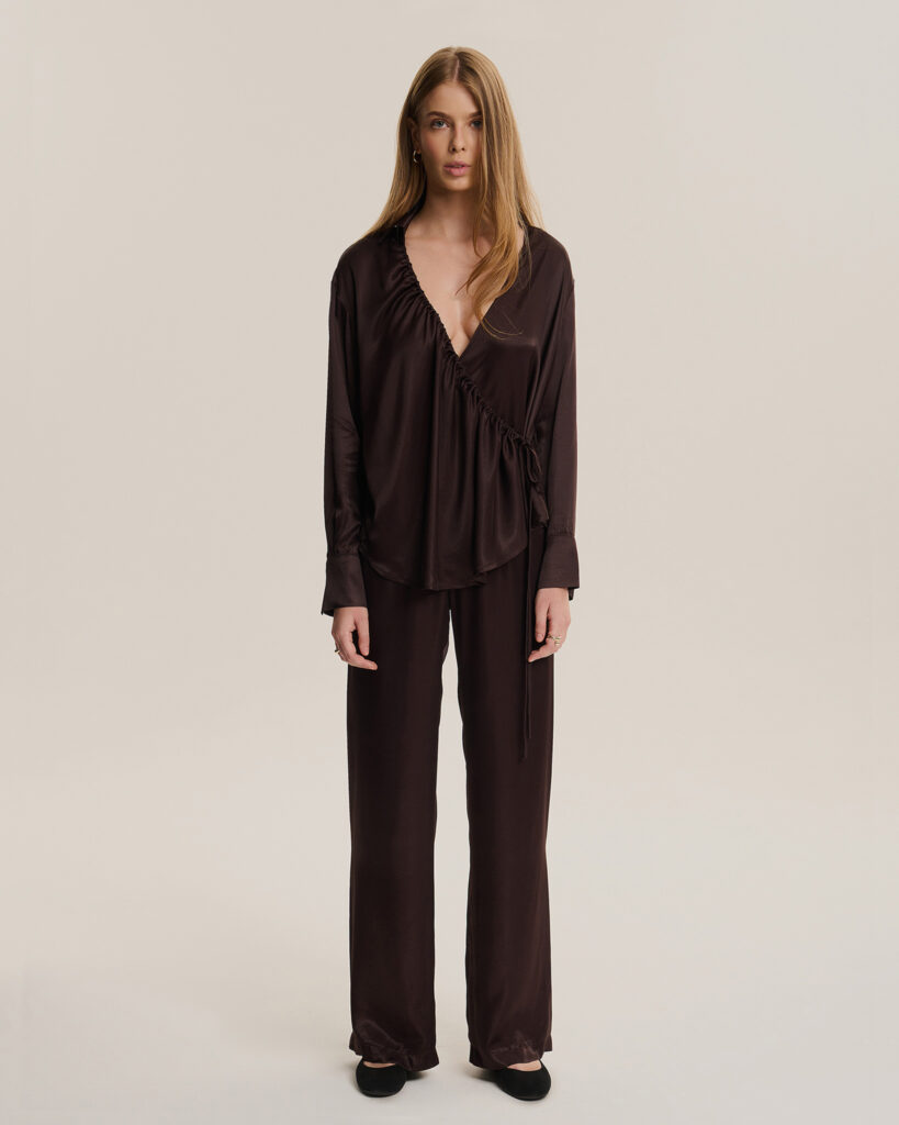 Koszula z dekoracyjnym marszczeniem z przodu. Dzięki wiązaniom dostosujesz ją do swojej sylwetki oraz dopasujesz głębokość dekoltu. Mankiety zapinane na guziki. Wykonana z wiskozy w satynowym wykończeniu w brązowym kolorze. Stwórz total look ze spodniami Sunset.