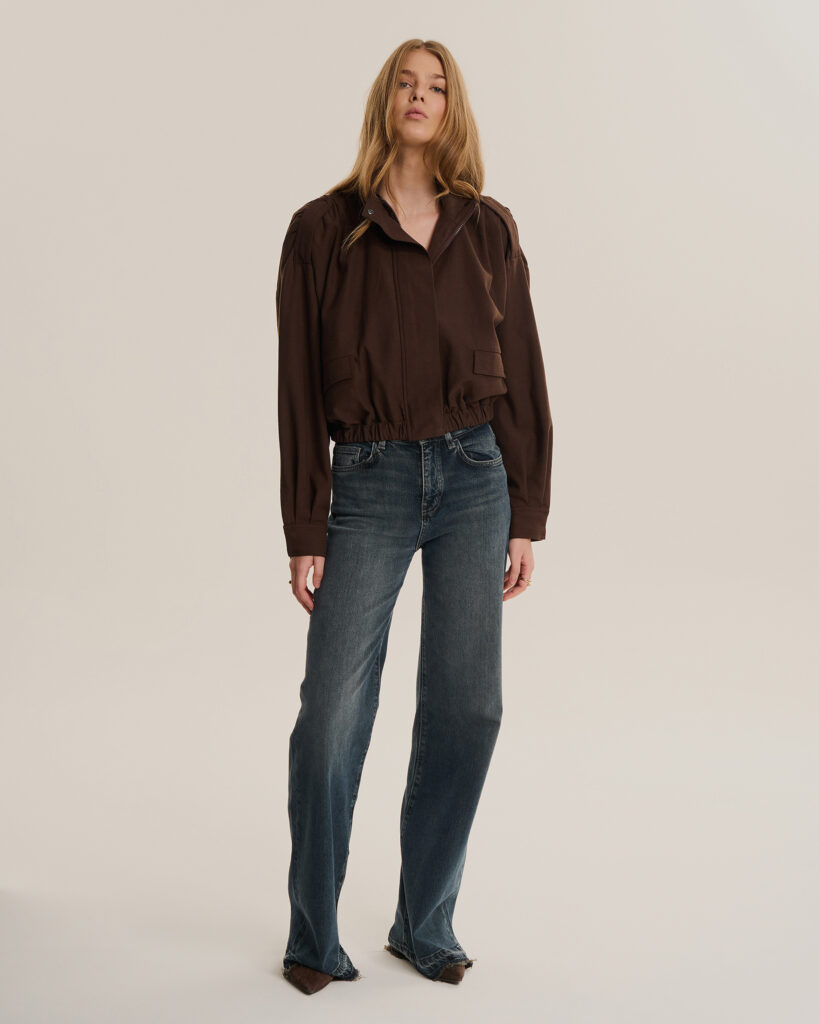 Krótka kurtka z wysokim kołnierzem w stylu lat 80. Kieszenie z przodu, zapięcie na suwak oraz dodatkowo na napy. Na ramionach marszczenie podkreślone delikatnymi poduszkami. U dołu wykończenie gumą. Wykonana z grubiej tkaniny w kolorze brązowym. Stwórz total look z bermudami Bea.