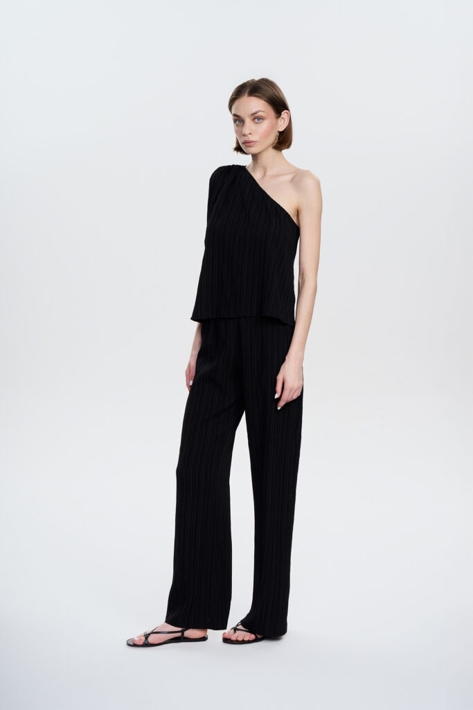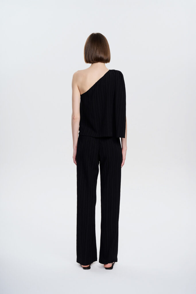 Klasyczne długie spodnie z gumką w talii oraz szerokim podwinięciem u dołu nogawki. Krój idealny na każdą porę dnia i roku. Stwórz total look z bluzką Layla lub t-shirt’em Olly. Wykonane z lekkiej, kreszowanej tkaniny w kolorze czarnym z widoczną strukturą.
