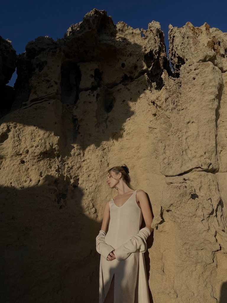 Sukienka z dzianiny o długości midi z rozporkiem z przodu. Dekolt w literę V z przodu oraz z tyłu. Wykonana z miękkiej, delikatnej dzianiny.