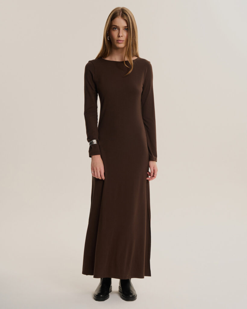 Długa dzianinowa sukienka na długi rękaw z rozporkami po bokach. Podwójna tkanina na przodzie, dekolt na plecach w kształcie litery U. Idealnie dopasuje się do ciała i podkreśli Twoją sylwetkę. Wykonana z przyjemnej w dotyku, brązowej dzianiny będącej mieszanką wiskozy, kaszmiru i lnu.
